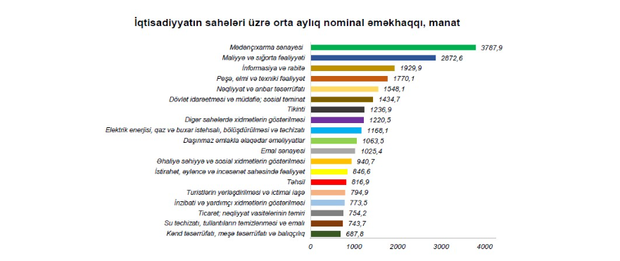 Həmçinin ən aşağı əməkhaqqı kənd təsərrüfatı sahəsində 687,8 manat, ən yüksək əməkhaqqı isə mədənçıxarma sənaysində 3787,9 manat qeydə alınıb.